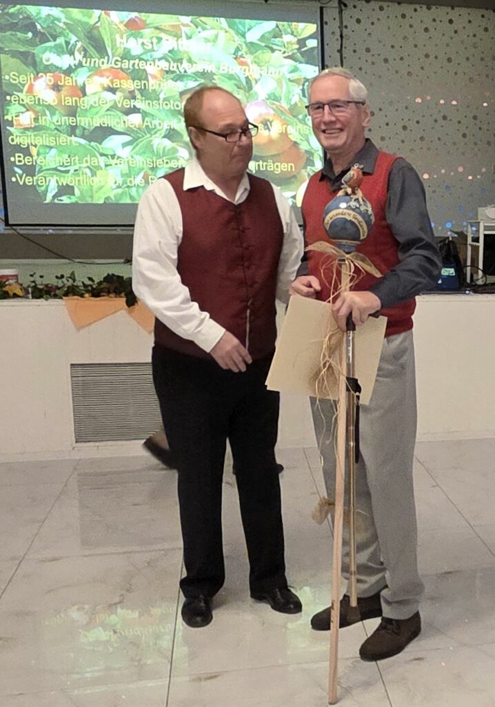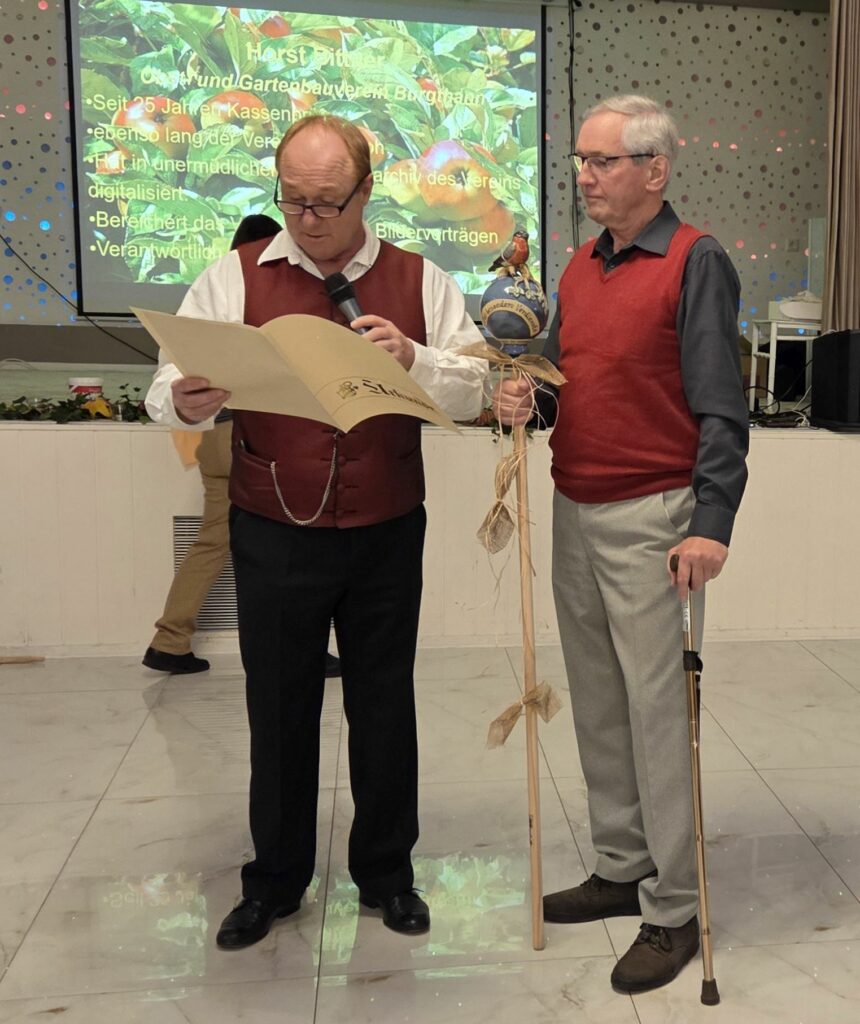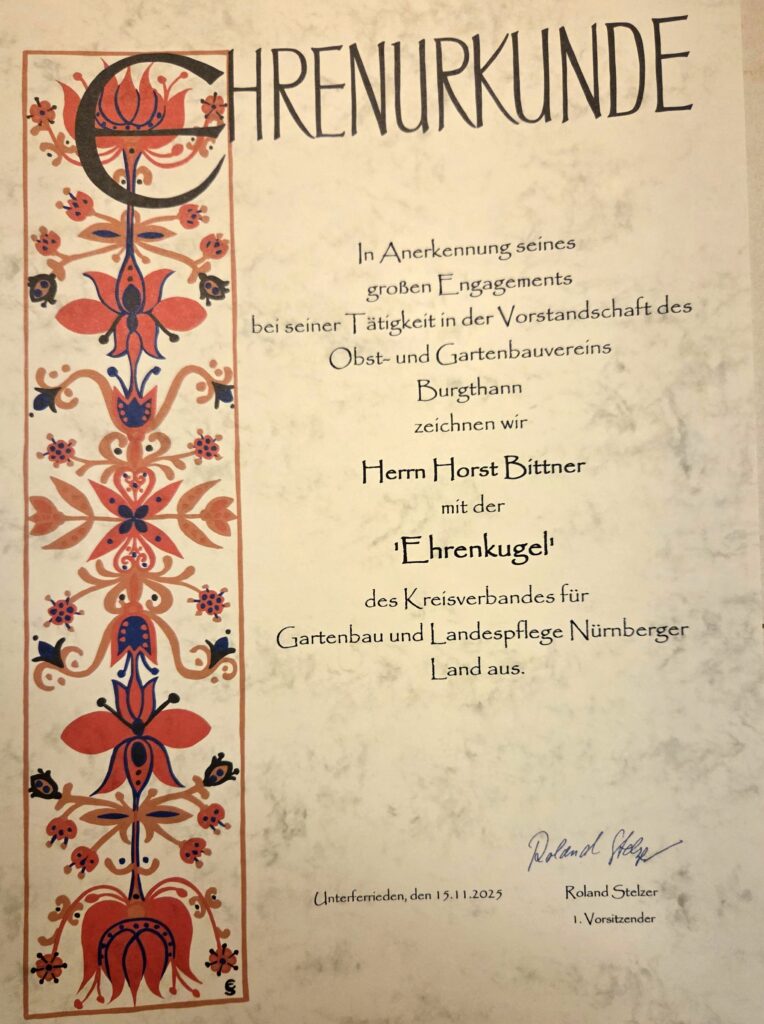 Aus dem Obst- und Gartenbauverein Burgthann wurde in diesem Jahr Horst Bittner, langjähriges Mitglied und Kassenprüfer, vom Vorsitzenden Roland Stelzer und Kreisfachberaterin Claudia Uebler mit der „Ehrenkugel des Kreisverbandes“ auszeichnet. Die Vereinsarbeit in Burgthann Herr Bittner hat den letzten 30 Jahren bereichert durch seinen Einsatz für den Aufbau des digitalen Fotoarchivs, die Bildervorträge aus dem Vereinleben, sowie seine Berichte von den Vereinsreisen. Die Kassenprüfung wird Herr Bittner weiterhin durchführen, die anderen Ämter musste er zuletzt aus gesundheitlichen Gründen an Manfred Heyland abgeben.